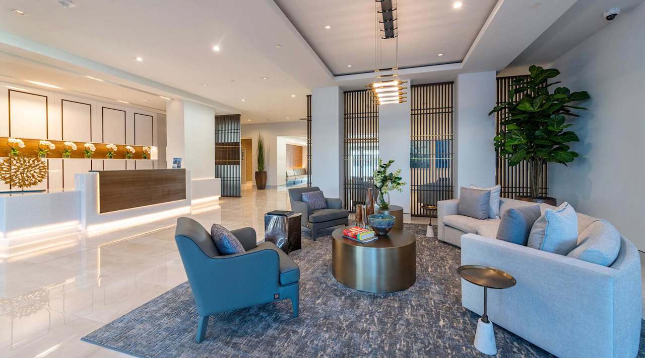 The flow-through lobby at Adagio goes from the porte-cochere to the Intracoastal pool and it features contemporary furniture and an elegant front desk.